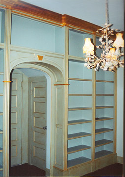 Home -- Services -- Mica GlazeMica Glaze Application In the library, Restoration Associates applied a glaze, gold mica powder and 23k gold leaf as per the owner's specifications. This project consisted of 4 bookshelves with fluted detail and dentil molding. Five doors received the glaze and gold mica powder application. the 2 1/2" crown molding received gold mica powder with a glaze as per the owner's specifications.